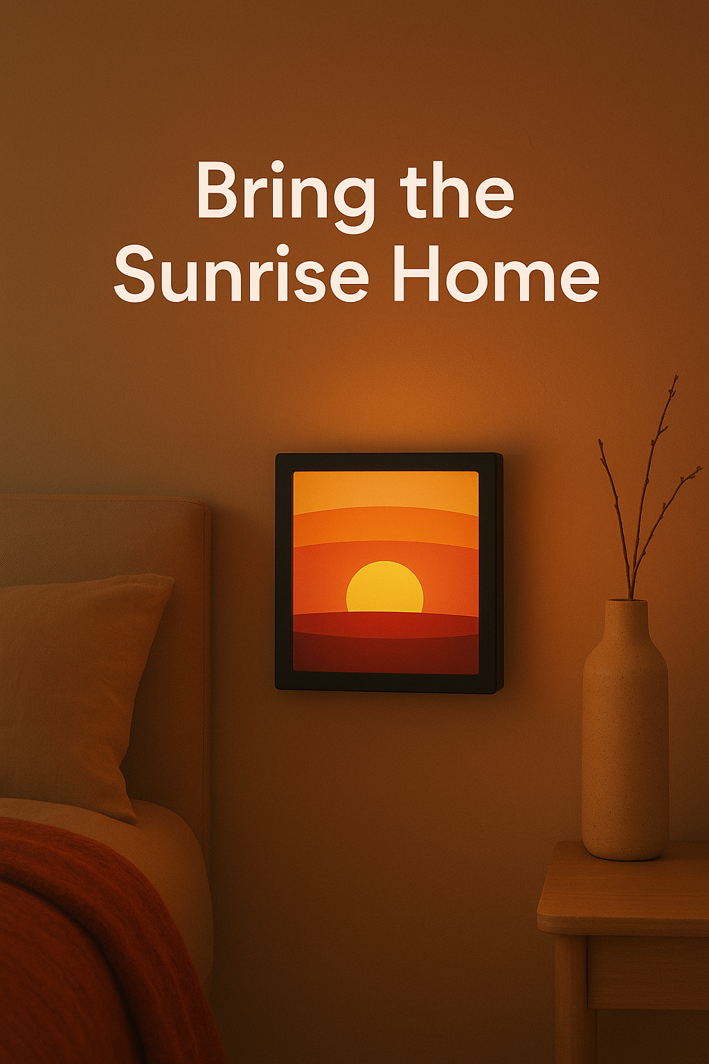 The mechanism slowly moves the sun, mimicking a real sunset, and requires no batteries or electricity.