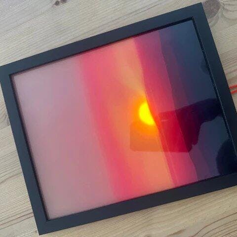 The mechanism slowly moves the sun, mimicking a real sunset, and requires no batteries or electricity.